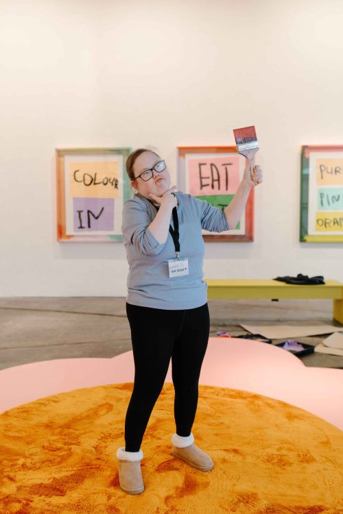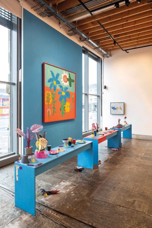 Leanne was also heavily influenced by her personal interests, family, food, health and wellbeing. The studio where she created the work is reminiscent of a scout hall which prompted associations with the film ‘Dirty Dancing,’ and the idea of introducing a karaoke stage into the Tramway exhibition, alongside a new body of large-scale text works and paintings of flowers. Read the review of the show in The List and FAD Magazine.